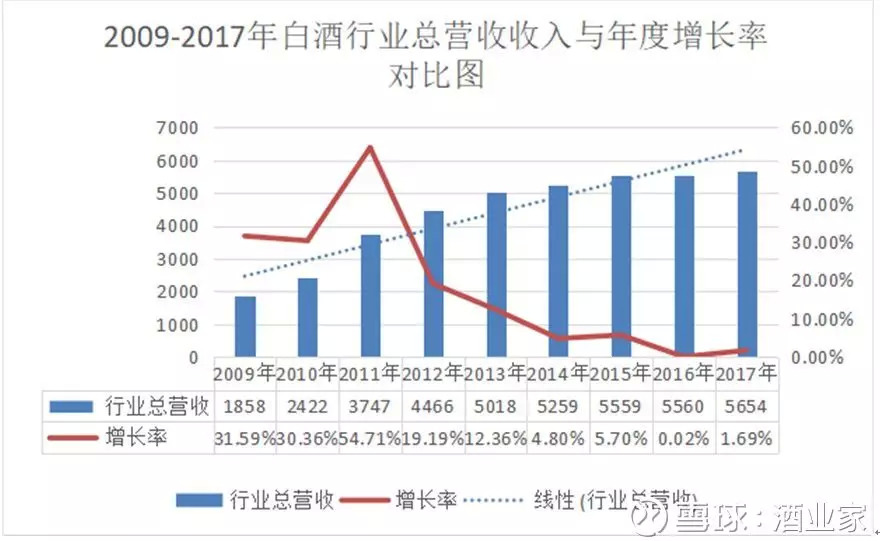 从数据来看,白酒整体行业发展呈上升趋势,在2011年达到顶峰,行业营收增长率一度超过50%,2012年,从限制“三公消费”到“限酒令”再到“禁酒令”,白酒行业逐步走入下坡路。在这几年期间,很多小酒企倒闭,白酒行业产量、收入逐渐走低,白酒行业进入挤压竞争时代。