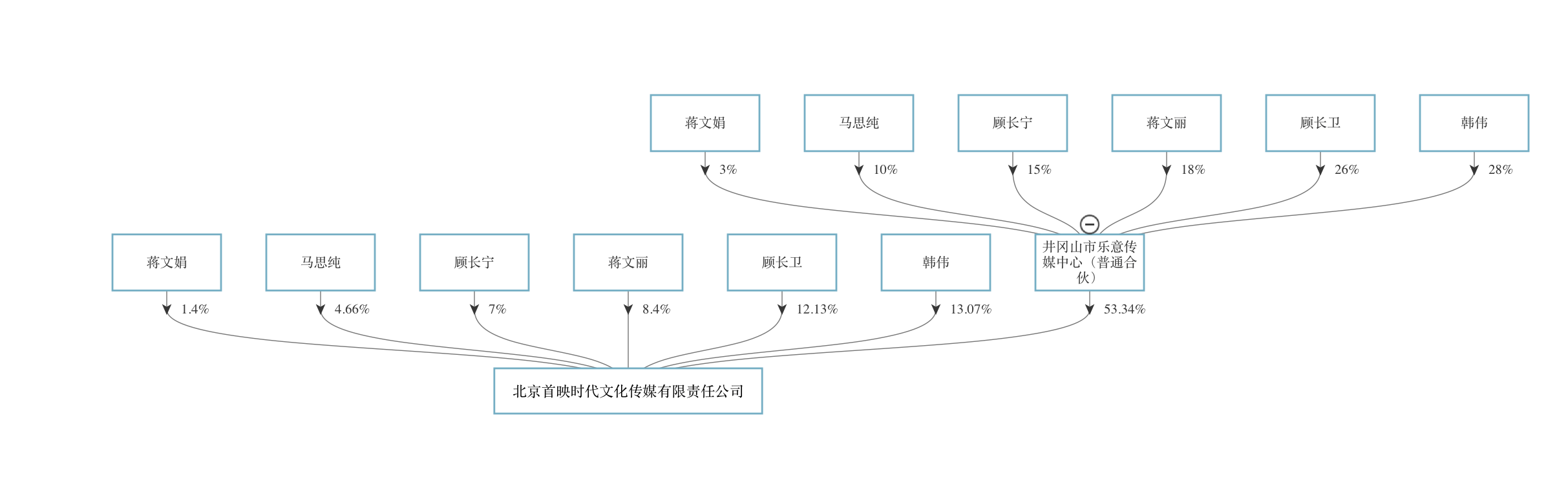 首映时代是一家明星控股的企业,旗下签约艺人有蒋雯丽、马思纯等人,其中马思纯2016年凭借着电影《七月与安生》当选金马影后。2016年首映时代增资扩股引入顾长卫、蒋雯丽、马思纯等明星股东。目前顾长卫、蒋雯丽夫妇以及顾长宁持股比例合计为27.53%,蒋雯丽外甥女马思纯及其母蒋文娟持股6.06%,此外首映时代的控股股东也有蒋雯丽家族。股权结构如下图:
