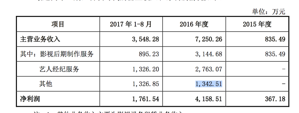 从首映时代方面来看,首映时代的营收结构变化较大,首映时代的盈利能力确实存在不确定性。在顾长卫等增资之前,首映时代2015年营收只有影视制作收入835.49万元,当年利润仅为367.18万元;2016年公司利润大涨增加了艺人经纪业务,实现营收7250.26万元,其中艺人经纪收入为2763.07万元,占比达到38.11%;2017年1-8月公司营收3548.28万元,其中艺人经纪收入为1326.2万元,占比为37.38%。