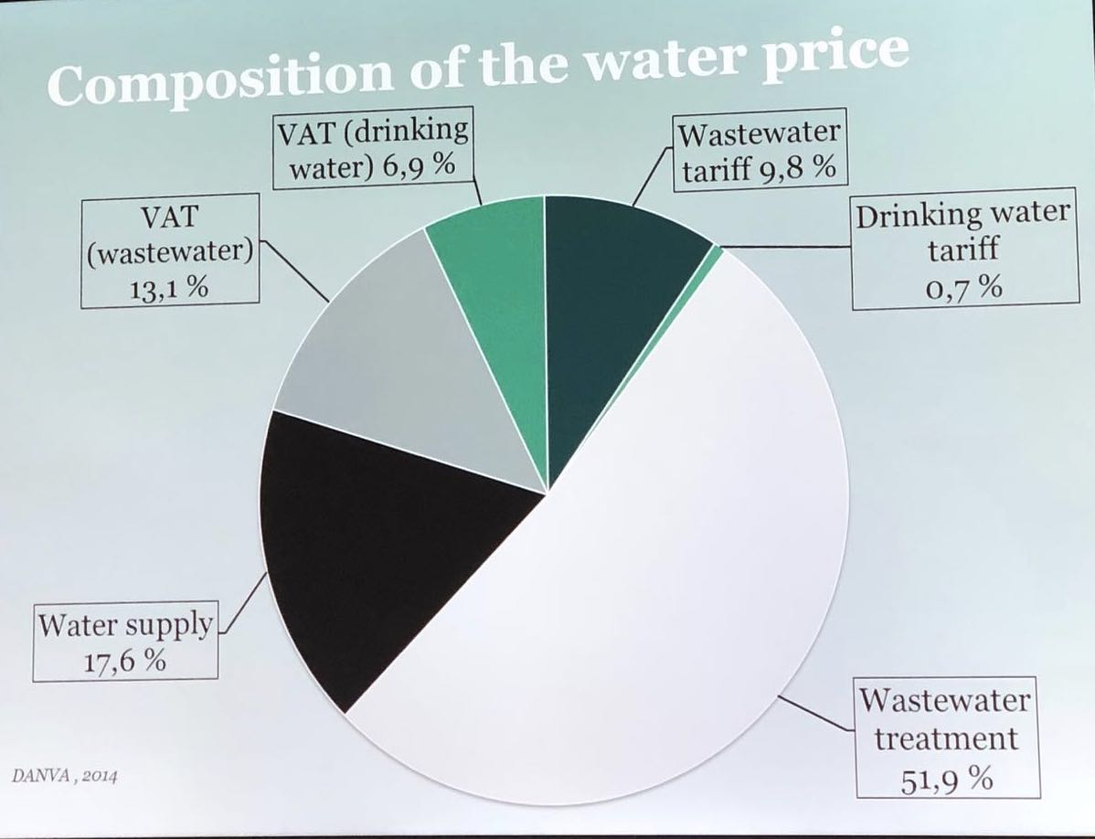 “1970年代,丹麦遇到许多水问题,包括用水太多、水污染等。”8月27日,丹麦环境署水资源特别顾问金姆·马兹比尔格(Kim Madsbjerg),在丹麦环境与食品部五楼会议室介绍说,过去30年,丹麦加大了水环境的治理,包括大幅提高水价,推动水处理技术的创新进步等。“水价快速上升,是因为包含了水价、增值税、污水处理成本等,其中污水处理成本在水价构成中的占比高达51.9%。”他说。