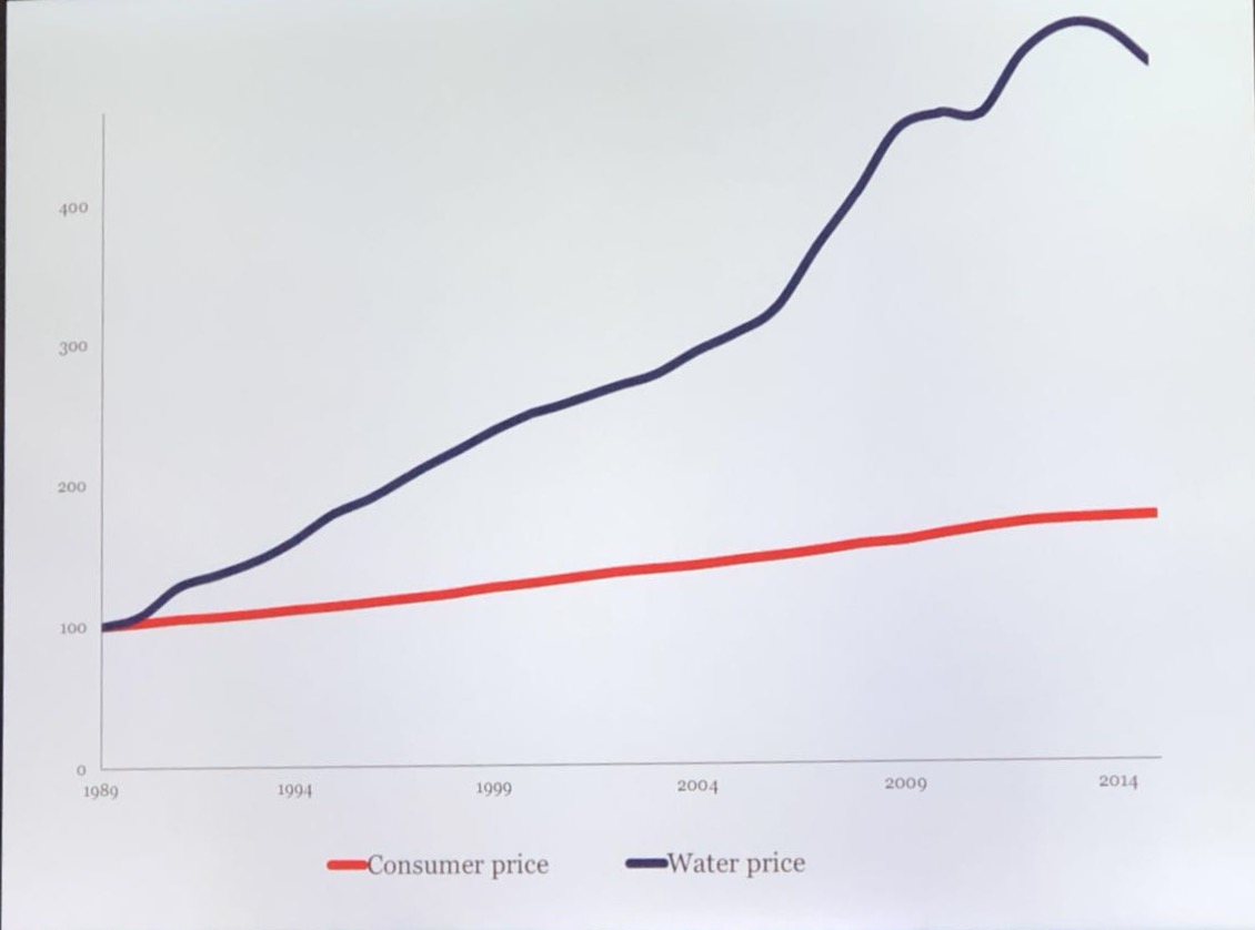 丹麦目前平均水价约为46.41丹麦克朗/立方米(约合50元/吨),在1989-2014年期间,丹麦的水价上涨了三倍,而物价涨幅变动不大。