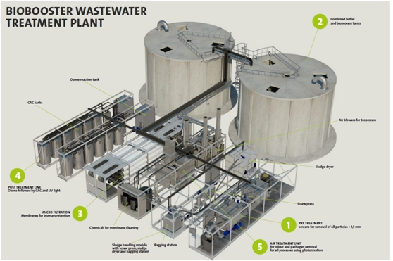 格兰富公司作为项目所有人,提供技术支持。处理厂的设计是基于膜生物反应系统(MBRsystem,Membrane Biological Reactor),由生物处理成和旋转陶瓷超滤膜组成。