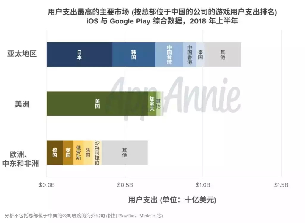 在APP Annie之前的数据中显示,2018年上半年中国出海手游的整体收入,超过一半是来自亚太地区。而通过近期的报告可以发现,其中日本收入约为4.1亿美元,韩国收入约2.8亿美元,东南亚收入约2.2亿美元——三大市场收入超过9亿美元,在亚太市场占比超过70%,在全球市场占比约30%。