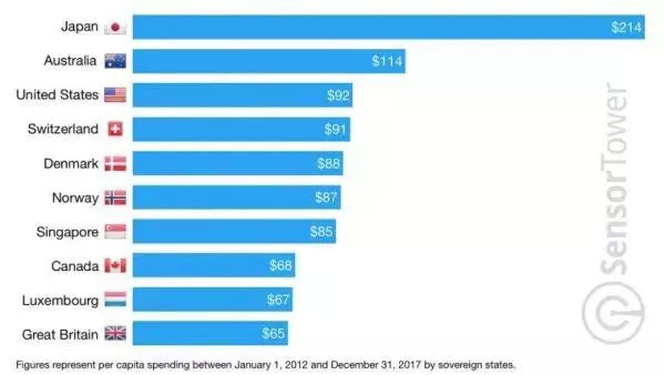 全球各国人均手游消费排名,日本遥遥领先
