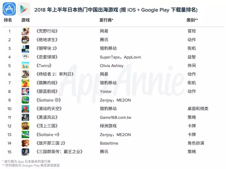 日本是中国出海手游的第二大市场(第一是美国),国产手游在2017年靠SLG和二次元两大类实现了“中日手游贸易”的逆差。而从今年产品来看,中国手游市场的吃鸡热潮也刮到了日本,《荒野行动》获得下载榜和收入榜的双冠,《PUBG Mobile》下载榜第二。此外《碧蓝航线》继续维持热度,稳居收入榜第二。