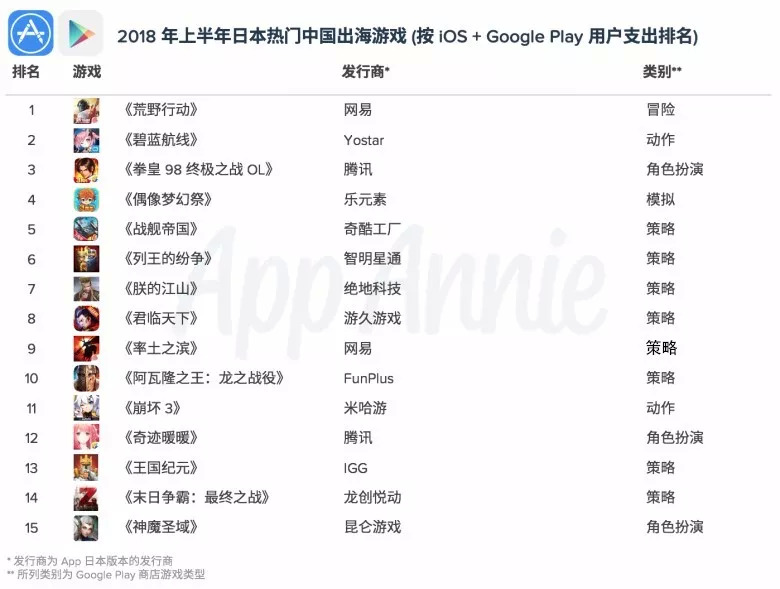 国产手游在日本市场的用户支出排行榜