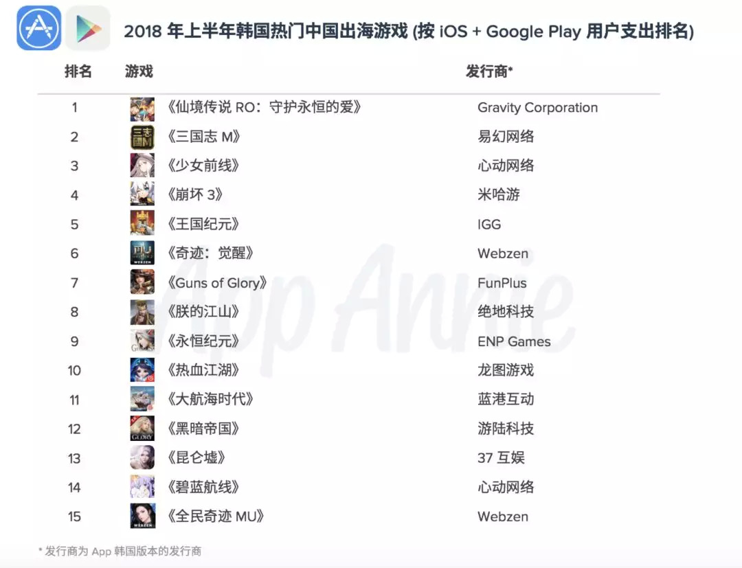 从2017年到2018年上半年,国产手游在韩国市场获得的用户支持进入一个快速增长期。而且根据APP Annie此前每个月公布的全球指数,韩国市场在2018年上半年,先后有《少女前线》、《仙境传说RO:守护永恒的爱》、《三国志M》、《碧蓝航线》、《奇迹:觉醒》等多款产品杀进iOS+Google Play综合收入榜Top 10。此外在7月,还有《永远的7日之都》也进入了Top 10。