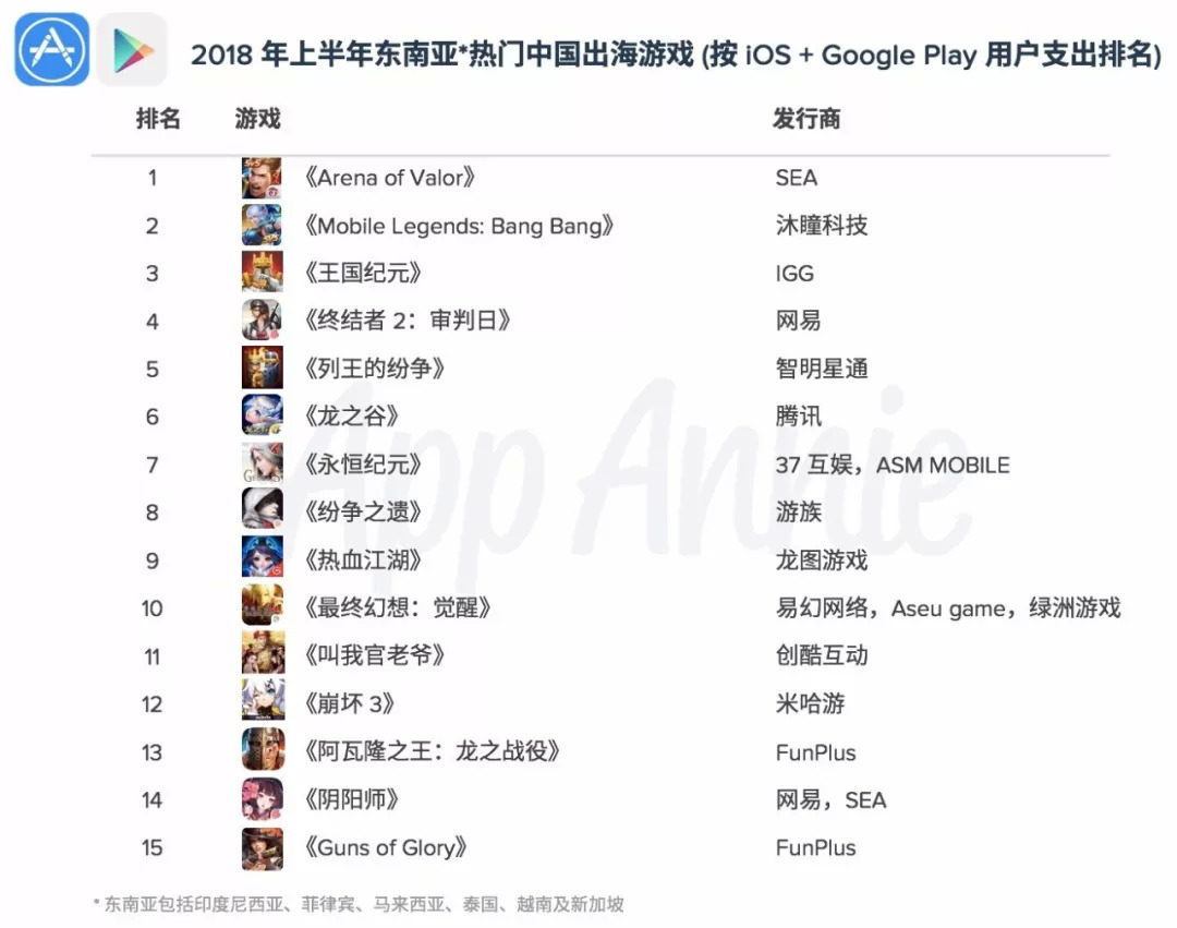 不过APP Annie并没有停止对中国出海手游的报告,随后又陆续发布了2018年上半年中国出海手游分别在日本、韩国以及东南亚的相关数据和产品排名。众所周知,日本、韩国和东南亚这三大市场囊括了中国出海手游在亚太地区的绝大部分收入,为此手游矩阵特意将三份报告的内容进行整合与分析,希望能为关注出海手游的朋友提供帮助。