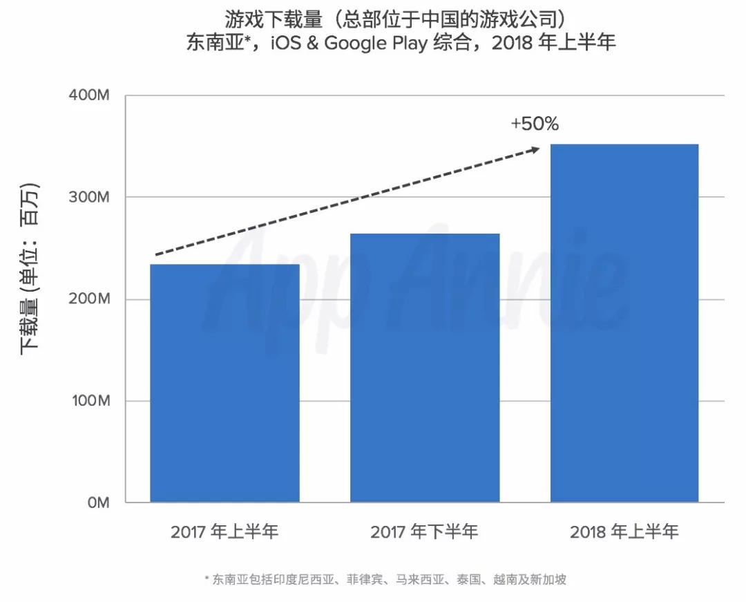 东南亚六国总人口5.6亿,国产手游今年上半年在东南亚市场的下载量是3.5亿次,大约每2个东南亚人贡献1次下载。