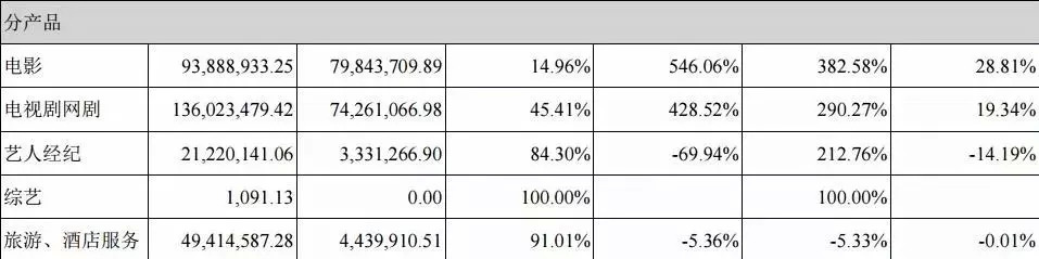 其中,作为营收重头的影视文化业务,同比增长122.94%,占总营收的83.2%。相比之下,旅游文化业务板块仅实现营收5050.7万元。