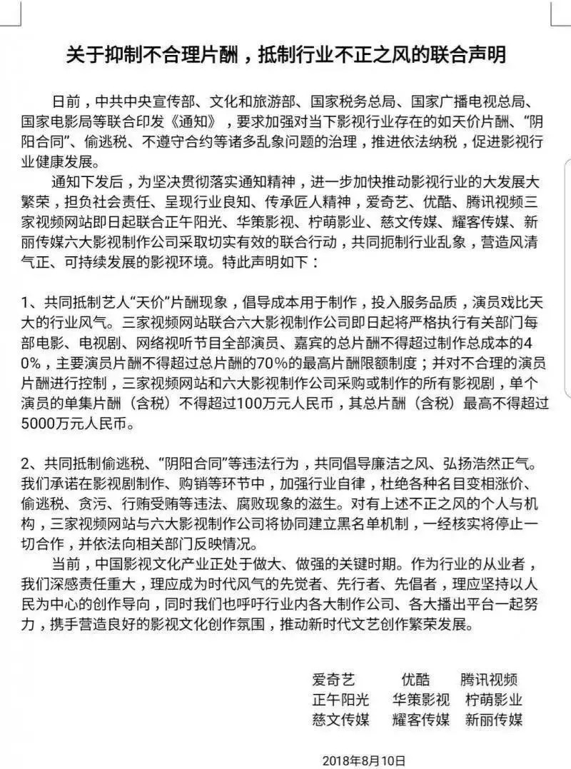 在崔永元爆料中的“4天6000万”将明星天价片酬又一次推上台面之前,2017年9月,中宣部、文化部、旅游部、国家税务局、广电总局、国家电影局等就已经联合出台了“限薪令”,提出演员片酬不得超过制作成本的40%的规定。今年,三大视频网站联合六家影视公司,也出面抵制天价片酬。