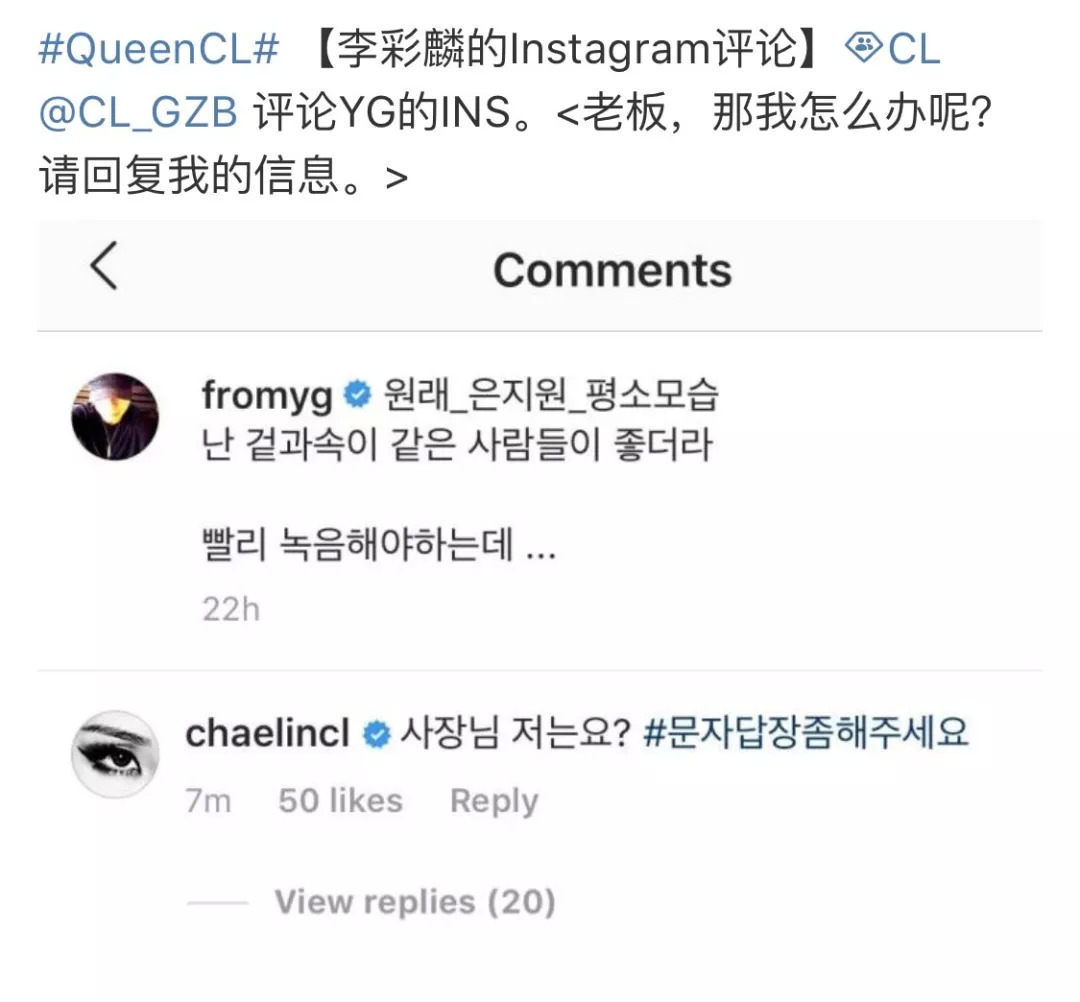 可以说,与YG的Solo续约不仅阻碍了CL继续在韩国发展的音乐事业,同时也影响了她的在美国的进程。今年7月14日,由于与YG方面沟通不畅,CL在社长杨贤硕Instagram下公开留言发问“老板,那我怎么办呢?请回复我的信息”。该留言一出,不少韩国网友跟着留言指责杨贤硕的不作为,有一位网友表示如果没有2NE1和Bigbang,应该也不会有现在的YG,干脆放CL走更好一些。