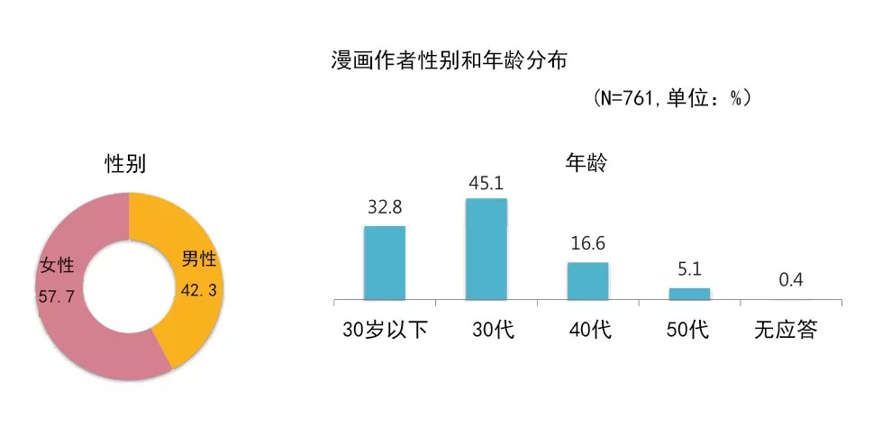 在761名受访者中,女性作者占比为57.7%,男性作者占比为42.3%;30代(30~40岁)的作者占比最高为45.1%,其次是30岁以下的作者占比为32.8%,总的来看,漫画作者的年龄主要集中在40岁以下,占比为77.9%。