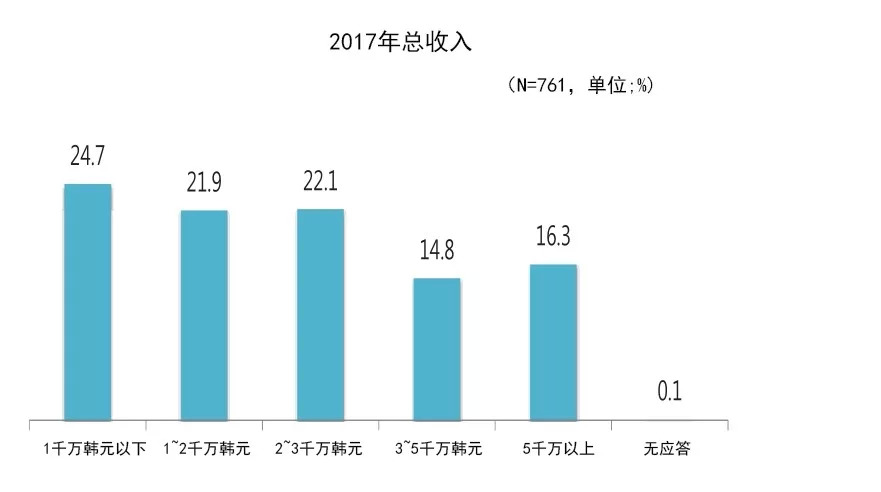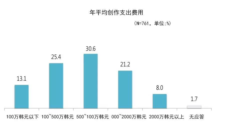 就2017年的总收入情况来看,68.7%的作者表示年收入在“3000万韩元(约18万人民币)以下”,年收入达5000万(30万人民币)韩元以上的作者占比则为16.3%。