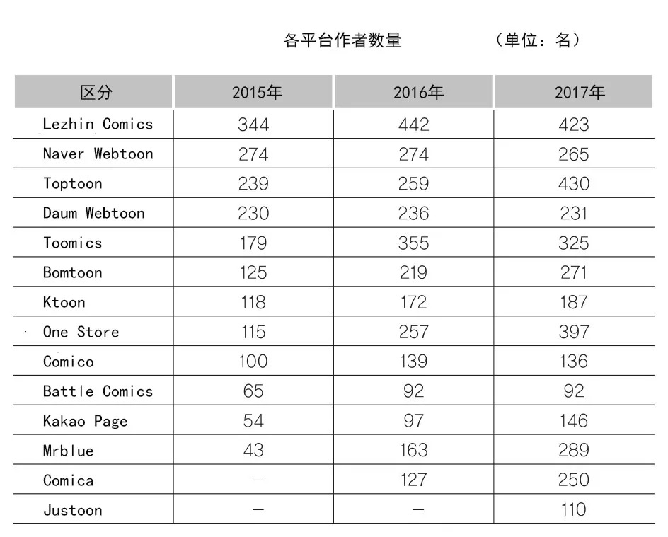 2017年Toptoon的作者数量为430名,Lezhin Comics为423名,其次分别是OneStore 397名,Toomics 325名等。此外,以免费观看为基础的Naver Webtoon作者数量为265名,Daum Webtoon 231名,Ktoon 187名等。