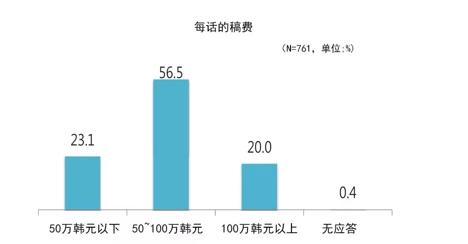 细分来看,每话稿费“50万~100万韩元(3000~6000元人民币)”的占比最高为56.5%,其次分别是“50万韩元以下”占比23.1%以及“100万韩元以上”占比20%等。在每月稳定更新4话的基础上,大部分作者能够获得超过200万韩元的月收入。