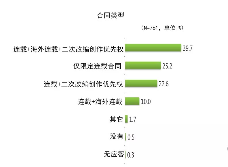 其中总括性的“连载+海外连载+二次改编创作优先权”合同签订比例最高为39.7%,其次分别是“仅限定连载合同”占比25.2%,“连载+二次改编创作优先权”占比22.6%,“连载+海外连载”则占比10%等。