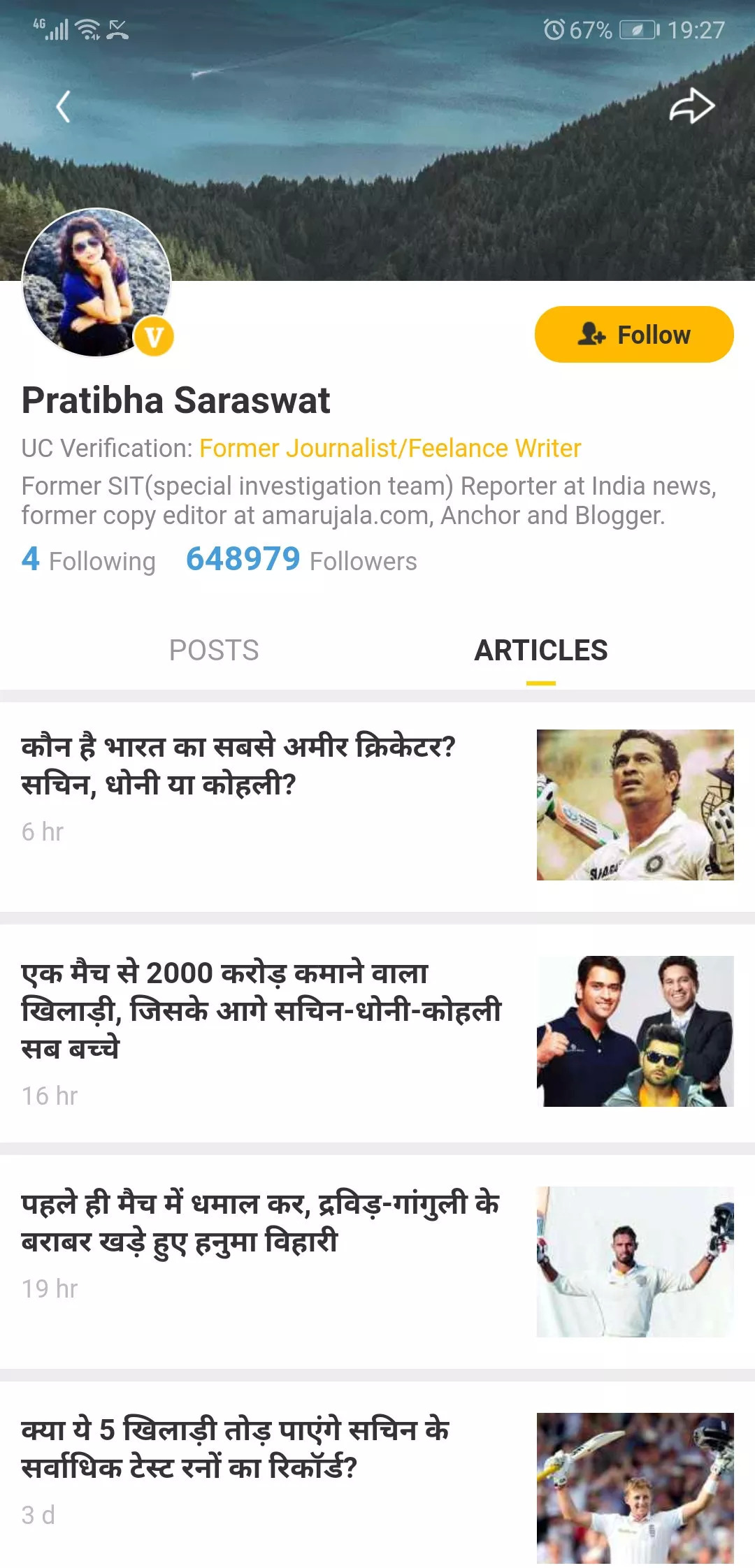 如果用中国的话语体系来形容,Pratibha Saraswat已经是一个UC上的“大V”了。不到一年的时间里,她通过在UC上写跟板球相关的内容,已经积累了近65万的粉丝。