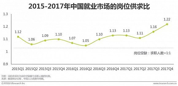 近几年国内经济环境相对稳定,各行业对人才的需求增加,但在不同时期对不同类型的人才需求有所不同,人才缺口逐年凸显。同期随着高校扩招、自费出国留学人群增加,高校毕业生人数和学成归国人数不断上升,国内待就业人口数提升。从市场岗位供求趋势来看,虽然2015年以来岗位空缺与求职人数比率波动性较大,但市场整体处于供不应求的状态,尤其在2016年第二季度后,市场岗位空缺与求职人数比例呈明显上升态势,并保持在高位,国内就业市场竞争激烈。
