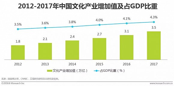 从中国文化产业的发展趋势来看,近几年我国文娱产业发展稳步增长。根据国家统计局数据显示,我国文化产业增加值突破3万亿元,文化产业占国家GDP的比重达超过4%。根据国家相关规划,2020年中国文化产业的规模有望超过5万亿元。我国数字娱乐产业进入发展的黄金期。同时,根据CNNIC的数据表明,2017年我国网络视频、音乐、游戏及文学的用户规模分别为5.8亿、5.5亿、4.4亿和3.8亿,用户群体广泛且对数字娱乐的需求十分旺盛。