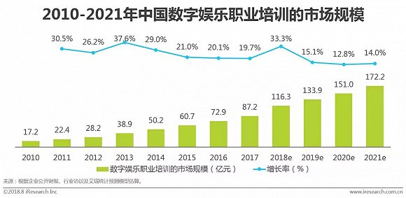 目前国内数字娱乐职业培训行业整体处于发展早期阶段,但其处于快速发展期,2018年我国数字娱乐职业培训市场规模预计达116亿元。