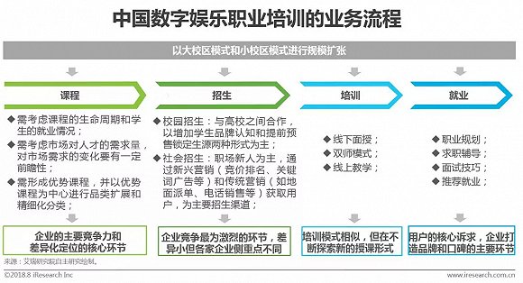 数字娱乐职业培训的主要业务流程分为“课程-招生-培训-就业”这几个环节。课程的设置是企业区别于其他竞争对手的主要竞争要素,它不仅体现了企业对市场需求的认知和预判,而且依托优势课程积累的经验和资源,企业可以进行横向和纵向的品类扩张。现阶段企业的招生策略已经比较成熟,尤其是针对C端用户的社会招生,新兴营销(如竞价排名、关键词等)和传统营销(如地面派单、电话销售等)均是企业竞争的主要手段,因此在该环节各家企业根据自身发展阶段和优势的不同而有不同的侧重。在培训环节,各企业若想做出差异化竞争其投入产出一般不成正比,因此并非各家竞争的主战场。现阶段业内玩家在就业环节中提供的服务模式基本一致,未来能最大限度完成用人单位需求和学员需求之间匹配的培训机构,将在品牌和口碑方面获得新的机会点。