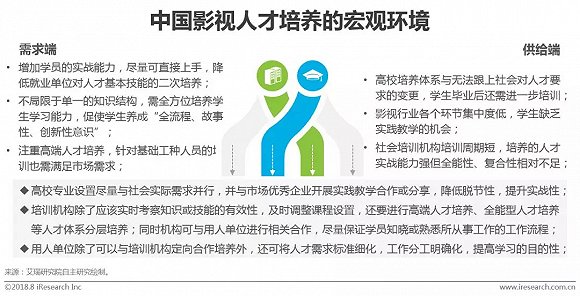 据国家统计局统计,2016年我国共播出电视剧22.72万部,共10232家公司获得《广播电视节目制作许可证》,国产电影收入287.47亿元。影视行业发展旺盛的同时对影视各环节人才尤其是影视后期特效和后期制作人才的需求极高,但现阶段的状态是供需市场一片繁荣但供需关系并不对等。一方面,需求端希望聘用的人才是全能的,可以直接用的,但是他们对人才的标准往往定义不明确,这使得人才培训机构在建立人才培养体系时需在培养周期、费用、就业等方面做权衡;另一方面则是受我国教育体系所限,学校在学科专业设置、教学内容等方面与社会脱节严重,对人才的培养更重理论而对实操性的培养相对弱化,大部分毕业生的能力与用人单位对人才的诉求之间存在一定差距。