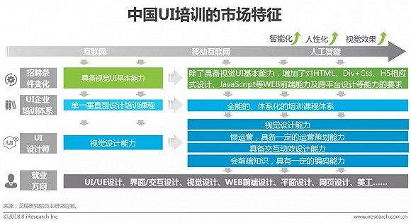 UI(User Interface)设计是指对软件的人机交互、操作逻辑、界面美观的整体设计,简而言之为用户操作界面设计,如APP操作界面,网页操作界面。UI培训兴起于移动互联网对各类APP开发相关人才需求的浪潮,并在VR/AR、AI等新鲜事物的涌现过程中,伴随着产品更换成本的降低、产品智能化程度的提升,用户对产品的人性化、视觉效果等有更高的要求,这要求UI设计人员不仅要具备基本的视觉设计能力,还需在运营、交互、动效、编程等方面有一定的储备,与之相关的UI培训企业也要适应市场需求变更而不断调整课程体系的广度和深度以保证人才输出的有效性。