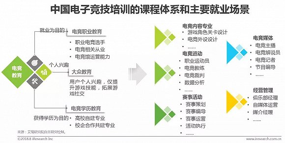 目前我国的电竞培训主要是分为职业教育、学历教育和大众教育三大类。职业教育以就业为目的,大部分都是半理论半实训的教学模式,培训周期短但针对性强,企业大部分都会承诺就业或者推荐就业。学历教育则以培养学生完成学历/学位为目的,多采用校企合作的模式,企业为学校提供电竞培训内容,学制时间在2-4年。而大众教育则完全就是考虑用户的个人兴趣爱好而提供的能够提升用户游戏技能的课程。在电竞市场供不应求的状态下,用户的就业市场广阔,目前可以从事电竞运动、电竞赛事、电竞媒体等多个领域的多品类工作。