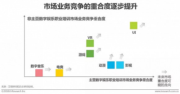 目前数字娱乐职业培训各业务竞争重合度提升主要体现在以下两方面:一方面,一些主流的主营数字娱乐职业培训的企业开始进行不同课程品类扩张,以及同品类培训课程服务覆盖半径变长,与其他培训机构同品类竞争加剧,这对企业打造课程优势、寻找差异化竞争提出更高要求;另一方面,以编程闻名的非主营数字娱乐职业培训企业已布局数字娱乐职业培训的部分领域,现阶段UI的竞争重合度最高,其次是VR和游戏方面的竞争,未来市场竞争品类将进一步深入至其他领域。因此在未来的市场争夺战中,业内玩家找准自身市场定位与优势、优化就业服务体系将尤为重要。