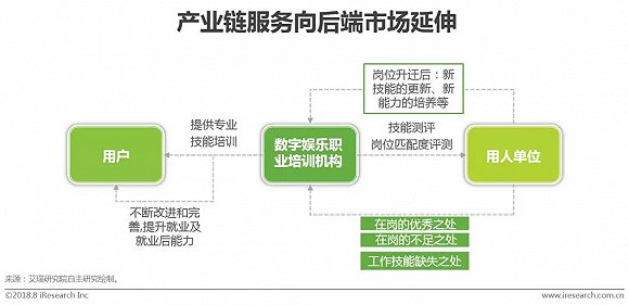 现阶段数字娱乐职业培训企业除了需要不断优化课程体系,实现体系化教学外,还可以在产业链后端市场寻找新的盈利点。一方面,培训机构扮演的是向用人单位输送人才的角色,人才是否符合岗位需求是用人单位最为关心的,此时若能与用人单位共同建立一套适合用人单位的人才评价系统,如技能测评、岗位匹配度评测等,既能提升用人单位对培训机构输出人才的满意度,又将倒逼培训机构重视人才全面性的培养;另一方面,向用人单位提供优质人才后并不是终点,还需实时关注用人单位对人才的持续反馈,对于认可之处可持续发扬,对于不足之处则需要不断优化改正并加以完善。总之,培训机构通过与用人单位建立深度合作后,将有助于提升人才与用人单位的适配率,延长用户的生命周期,打造招生+培训+就业的商业闭环,实现产业链的延伸及构建。