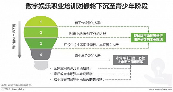 我国数字娱乐职业培训主要有两个大的增长点,一个是2011年以后移动互联网兴起,UI培训市场热,市场招生容易,就业前景广,国内数字娱乐职业培训市场迎来重要增长点;另一个是2018年,此时数字娱乐职业培训的市场规模的增长则源于以下两方面:一方面新兴技术不断涌现并与休闲娱乐相结合,市场对新兴数字娱乐类型人才处于供不应求的状态,就业状态良好,愿意参加相关课程培训的人数增加,如VR/AR游戏兴起时培训热潮及IP热剧兴起时对影视后期特效、后期制作等方面人才的渴求……另一方面,市场对复合型人才的要求增加,培训机构的课程体系更加系统与深入,同时在教学过程中不断融入新兴科技,企业对教学和教研的支出也在增加,表现为用户客单价会有所增长。