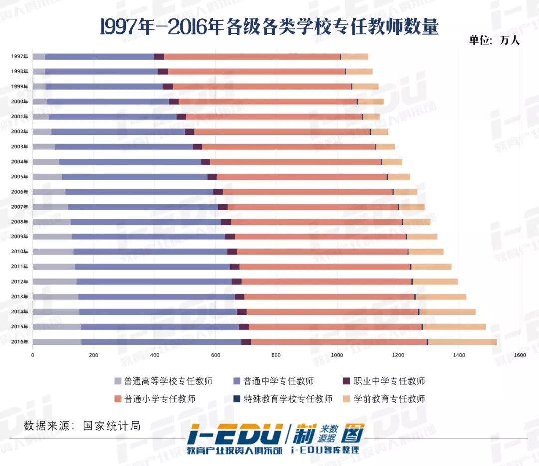 从全国各级各类学校专任教师数量上来看,1997年为1101万人,2016年则超过1500万人,20年累计涨幅接近40%。其中义务教育阶段教师占比逐年下降,从2003年前超过85%,下降到2016年的72%。而学前教育及普通高中教师数量增速较快,尤其是学前教育阶段,1998年学前教育专职教师仅为88万人,而2016年增长到了223万人。