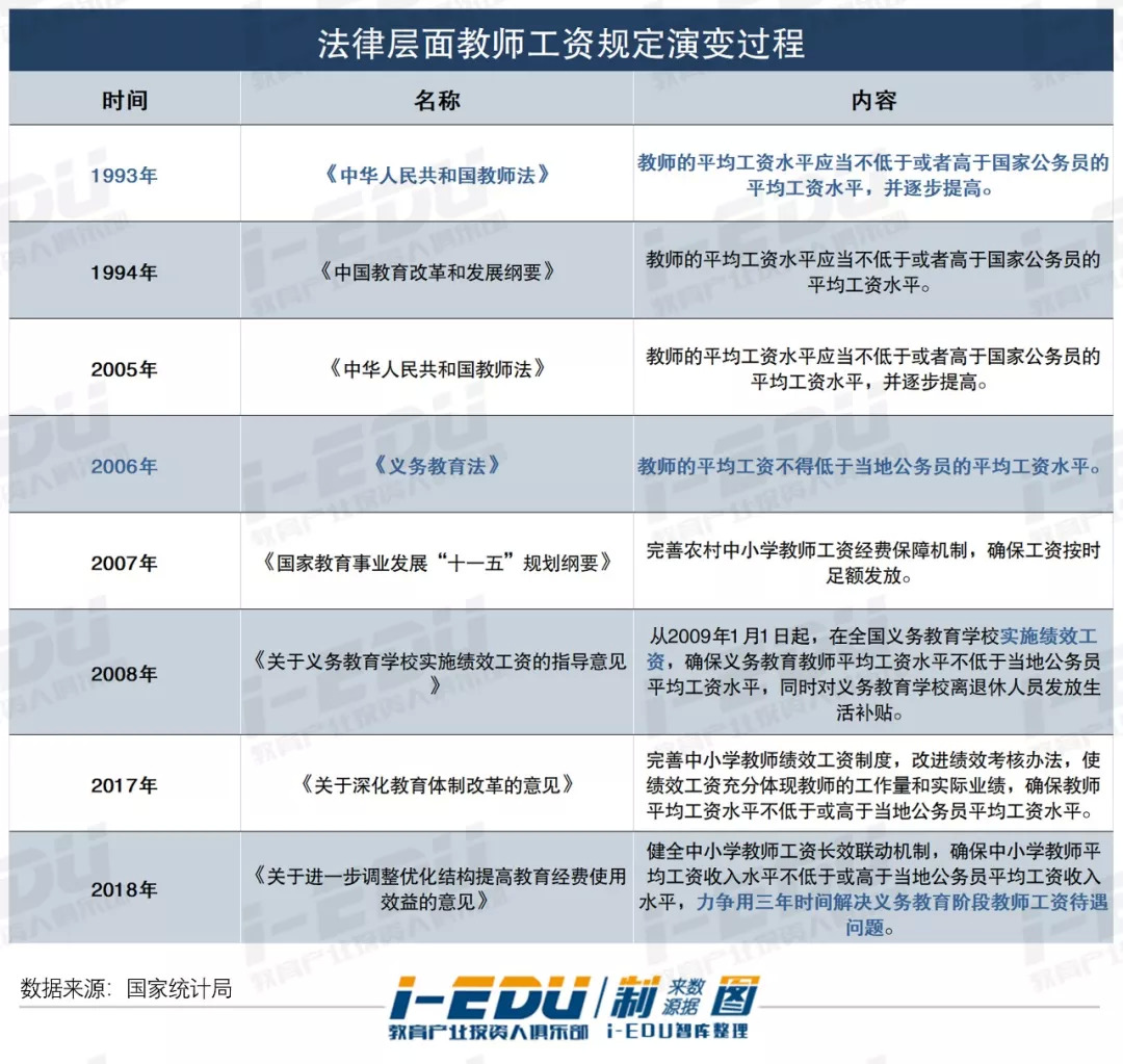 从政策方面来看,早在1988年国务院便颁布通知,全国教师工资当年上涨10%。在1993年颁布的《教师法》便有规定“教师的平均工资水平应当不低于或者高于国家公务员的平均工资水平,并逐步提高”。此后这一条文在不同法律条文中被多次提到,直至2006年重新修订的《义务教育法》首次对该规定作出进一步修订,《义务教育法》中规定:“教师的平均工资水平应当不低于当地公务员的平均工资水平。”对教师平均工资的对标对象作出了更确切的规定。