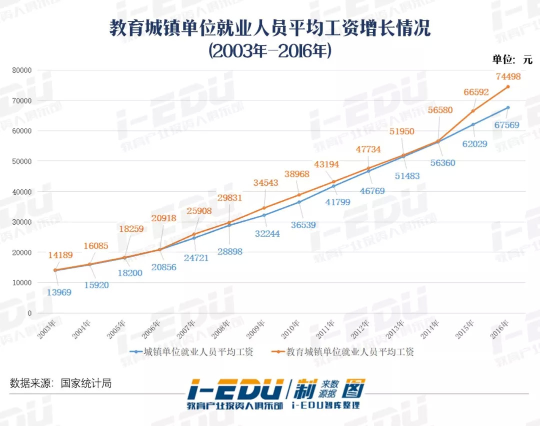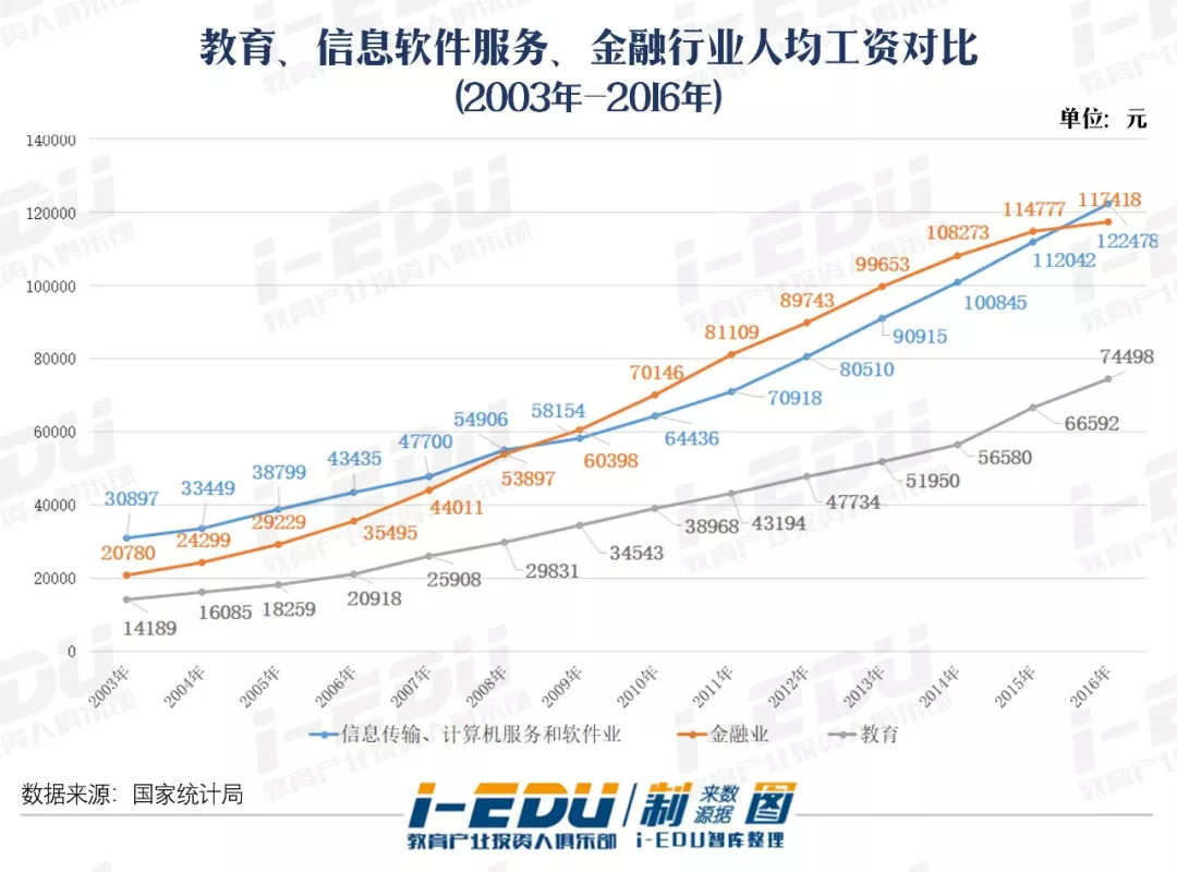 虽然教育行业的人均工资从2003年的14189元增长至2016年的74498元,年复合增长率为13.61%,但教育行业与信息软件服务、金融业相比,总体收入水平有较大差距。2016年,教育行业人均工资水平仅为金融业的63%。