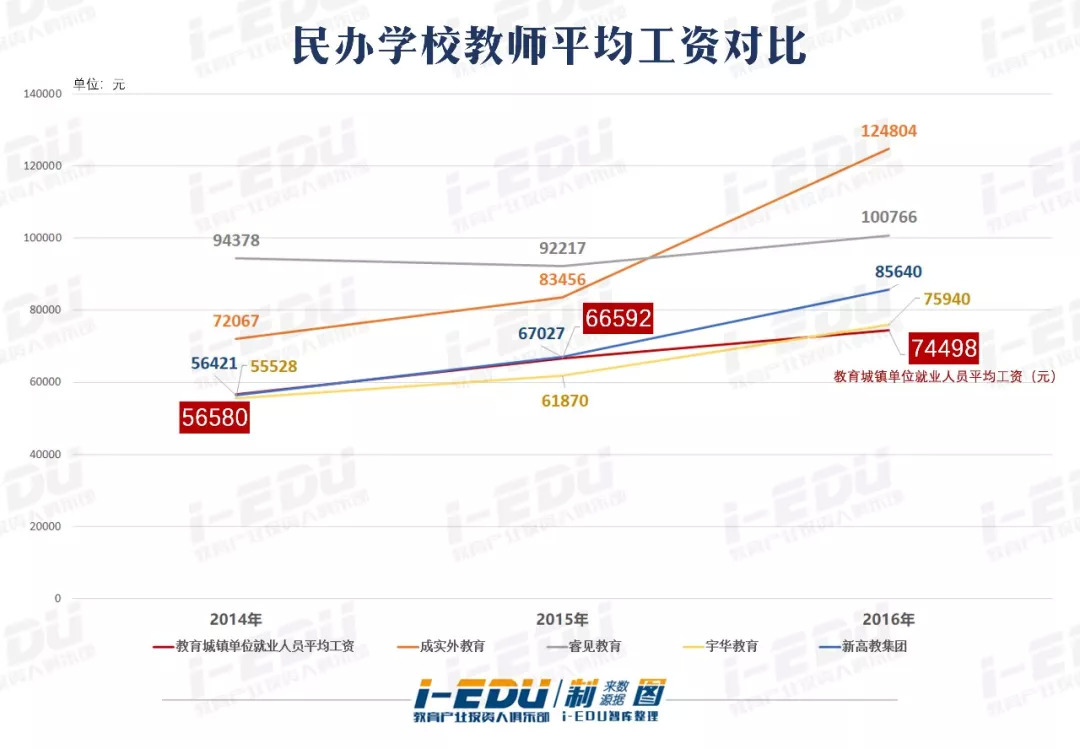由上图可以看出,2014年-2016年,教育城镇单位就业人员平均工资逐年递增,涨幅分别为17.7%、11.9%。睿见教育和成实外教育2014年-2016年教师平均工资均高于教育城镇单位就业人员平均工资,其中成实外教育自2015年起教师平均工资折线上升,远超过教育城镇单位就业人员平均工资;新高教集团2014年-2015年,教师平均工资与教育城镇单位就业人员平均工资基本持平,2015年之后实现反超;而宇华教育在2016年,教师平均工资才追平教育城镇单位就业人员平均工资。