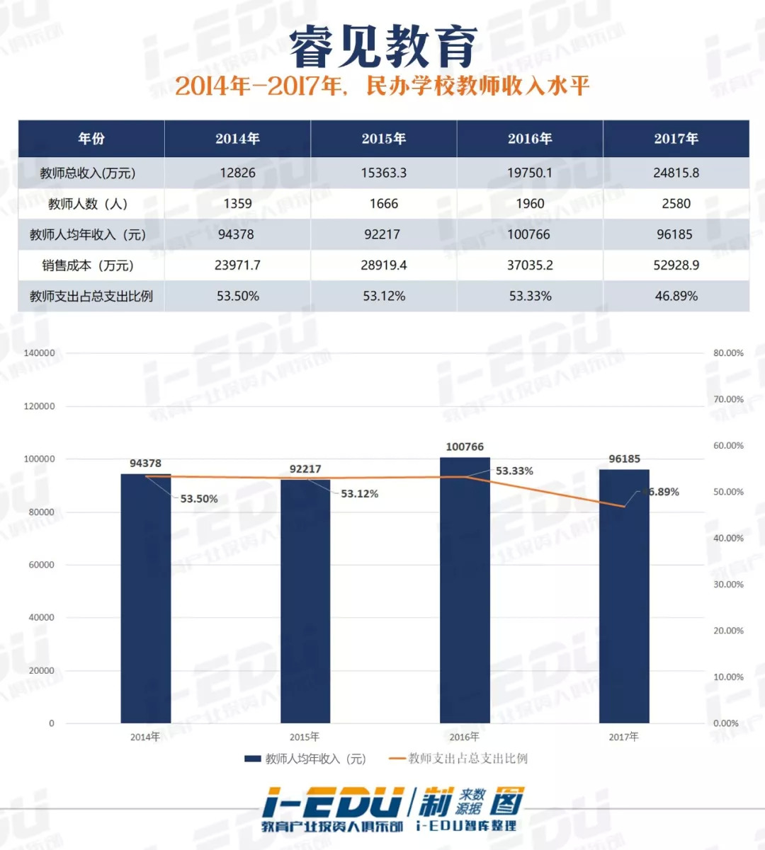 睿见教育2014年-2016年,教师人数及教师总支出逐年稳步上升,其教师人均年收入也处在缓慢增长状态,但2017年睿见教育教师人数较2016年增长31.6%,而教师总支出仅增长25.6%,教师人均年收入较2016年有所下降,教师支出占总支出的比例也从2016年的53.33%下降至46.89%。