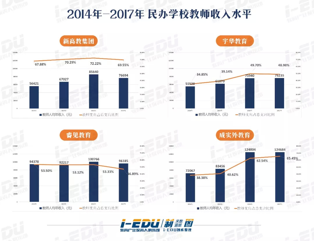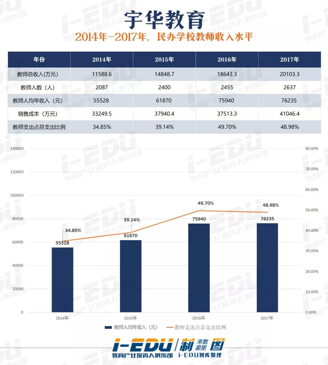 由上图可以看出,宇华教育2014年-2017年,教师人均年收入逐年增长,其中2016年涨幅最高,达22.7%,而2017年增速放缓,仅增长0.39%。但2017年宇华教育消费总支出较2016年增长9.4%,因此,宇华教育2017年教育支出占总支出比例较2016年有所下降,但依然达到48.98%。
