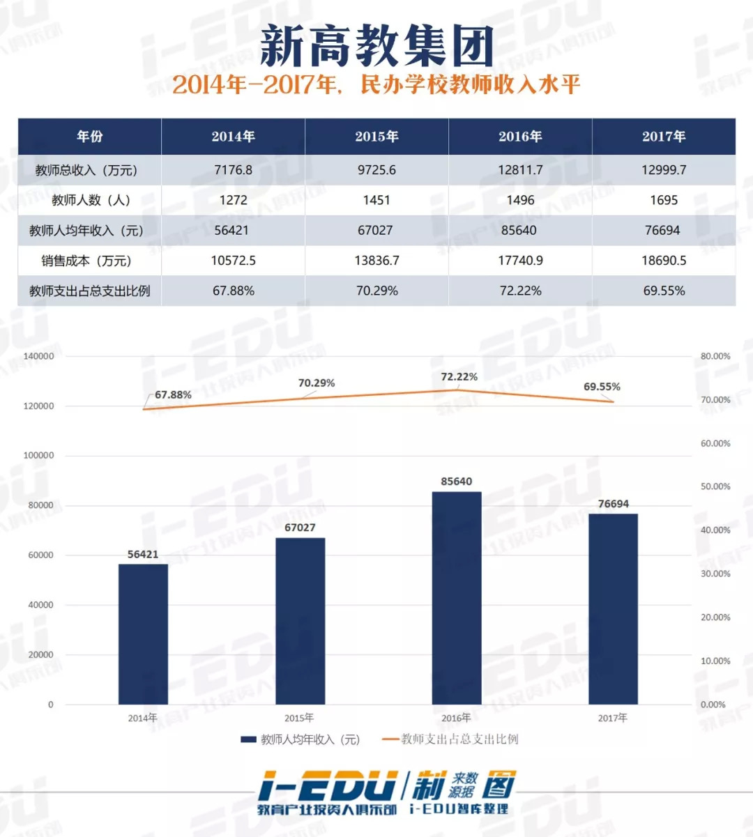 2014年-2017年,新高教集团教师人均年收入基本在5.5万元到7.5万元之间,4年的教师人数维持在1200人到1700人之间。2017年教师支出增长幅度并未赶上其教师人数的增长幅度,导致2017年教师人均年收入较2016年有所下降,但其总支出只增未减,教师支出占总支出比例从2016年的72.22%,减少到2017年的69.55%,教师支出占总支出的比重依然接近七成。