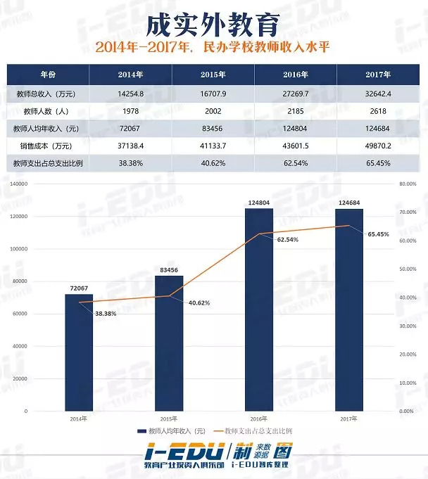 2014年-2017年,4年的时间,成实外教育的教师人数从1978人增至2618人,增幅达32.3%。同时,教师人均年收入从2014年的7.2万元增长至2017年的12.5万元,增幅达73%,远超四川省当年4万元的人均GDP。