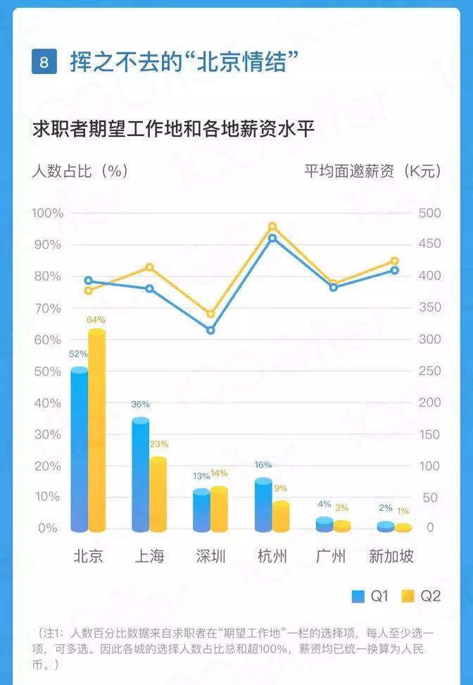 100offer 在《Q2 互联网薪资报告》中提到,即便北京平均薪资比起上海和杭州已经不占优势,但求职者对在北京工作的热情比起 Q1 反而更为高涨。