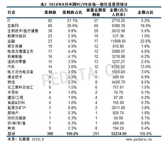 根据清科旗下私募通数据统计,8月VC/PE市场共发生投资案例数388起,同比、环比均下降11.4%;总投资金额共涉及522.34亿元人民币,同比下降13.3%,环比下降49.3%。本月单笔投资金额在10亿元以上的大额投资案例数为12起,环比下降33.3%。
