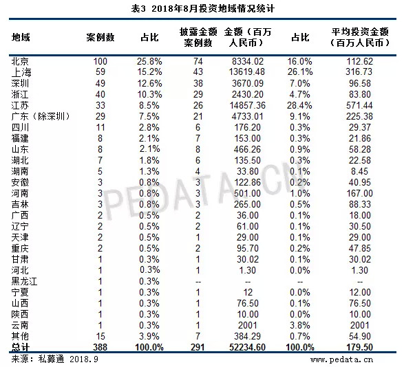 从投资地域上看【见表3】,8月发生的388起投资事件涉及25个省市。从案例数量上看,北京共发生100起投资事件,占投资案例总数的25.8%,排在各地区发生案例数的第一名;排名第二的上海共发生59起投资事件,案例数远低于排名第一的北京,占比15.2%;深圳发生49起投资事件,占比12.6%,排名第三。在投资金额方面,江苏、上海、北京地区持续获得VC/PE机构关注,所获投资金额远超其他地区,其中江苏涉及投资金额148.57亿元人民币,占总投资金额的28.4%,位列第一;上海地区涉及投资金额136.19亿元人民币,占比26.1%,位列第二;北京地区涉及投资金额83.34亿元人民币,占比16.0%,位列第三。值得关注的是,在多氟多化工股份有限公司定增发行股份获得VC/PE机构4.5亿元人民币投资的影响下,河南地区虽然仅发生3起投资事件,但其单笔平均投资金额达到1.67亿元人民币,位居所有地区单笔平均投资金额第四名。