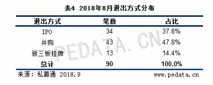 从退出方面看,8月共发生退出事件90笔,其中IPO退出数量为34笔,并购退出43笔,新三板挂牌退出13笔。在IPO审核全面趋严的大环境下,境内上市企业数量大幅下降,越来越多的VC/PE机构趋向于通过并购方式获得资本的退出。