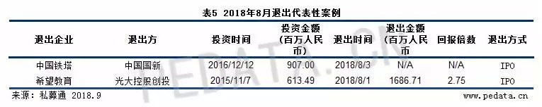 本月比较具有代表性的退出事件为中国铁塔和歌礼制药在港交所上市。8月8日,中国铁塔股份有限公司在香港证券交易所主板上市,发行股数431.15亿股,每股发行价格为1.26港币,共募集资金金额543.25亿港币。这是自中国邮政储蓄银行2016年以76亿美元上市交易以来全球最大的IPO。