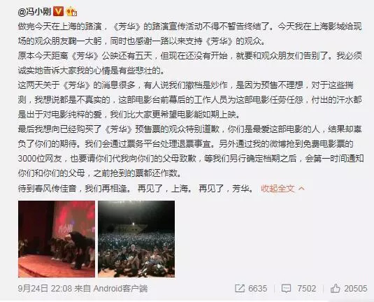 《芳华》在距公映还有五天时突然撤档,当时该片不仅已开启提前预售,冯小刚导演还在微博大方送出3000张电影票做活动,后来为了安抚观众情绪,冯导亲自发在声明向观众诚恳道歉,“你们是最爱这部电影的人,结果却辜负了你们的期待。我们会通过票务平台处理退票事宜。另外通过我的微博抢到免费电影票的3000位网友,也要请你们代我向你们的父母致歉,等我们另行确定档期之后,之前抢到的票都还作数。”