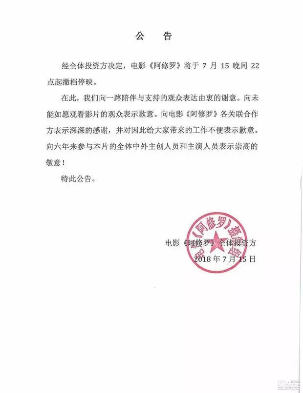 今年暑期档上映的《阿修罗》7月13日上映,7月15日晚片方宣布撤档,但在7月16日还有78万票房,由于这部电影的撤档通知发得非常仓促,影院大多早已安排好的第二天的场次,不愿意退掉提前预售已经卖出的票,所以撤档后的第二天,在个别影院仍然能看到该片。多位业内人士曾私下吐槽,《阿修罗》上映三天后又撤档的举动非常不明智,口碑扑街后再上映的结果,可能会更惨不忍睹。