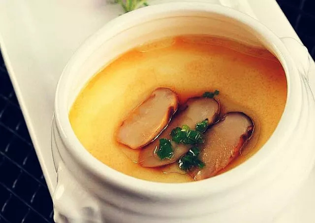 松茸用来蒸蛋羹,给小孩吃也特别合适。将松茸切片以后煲水,直到松茸的鲜味出来了,才离火摊冻。用这鲜美的松茸水来蒸蛋,如此才能让松茸的味道充分融入蛋羹里,而不是仅仅表面铺两片松茸了事。