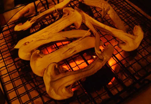 味精出现前,松茸一度被认为是极鲜之物。后来谷氨酸钠提高了所有人的味觉阈值,再吃松茸已经尝不到什么鲜味了。好在松茸还有香味,碳烤最能激发香味,尤其是微醺之时。藏族最常用的烤法是切片在碳火上烤制,日本的碳烤松茸则是放在炭火上方的铁丝网上,炭和铁丝网有严格的质量要求。烤好后厨师用手将菌柄和菌盖分开,再分别调味。也可用锡箔纸包住松茸,进烤箱200℃烤10分钟即可。
