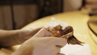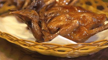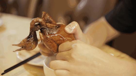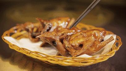 一手扶稳鸽身,空出的另一只手抓好鸽子的后腿,快而狠准地将其撕扯下来。此时,若是有肉汁顺流而下,你可千万记住一定要先将其吸吮而尽,这可是整只红烧乳鸽的精华所在,也是检验一只红烧乳鸽是否上乘的标准。